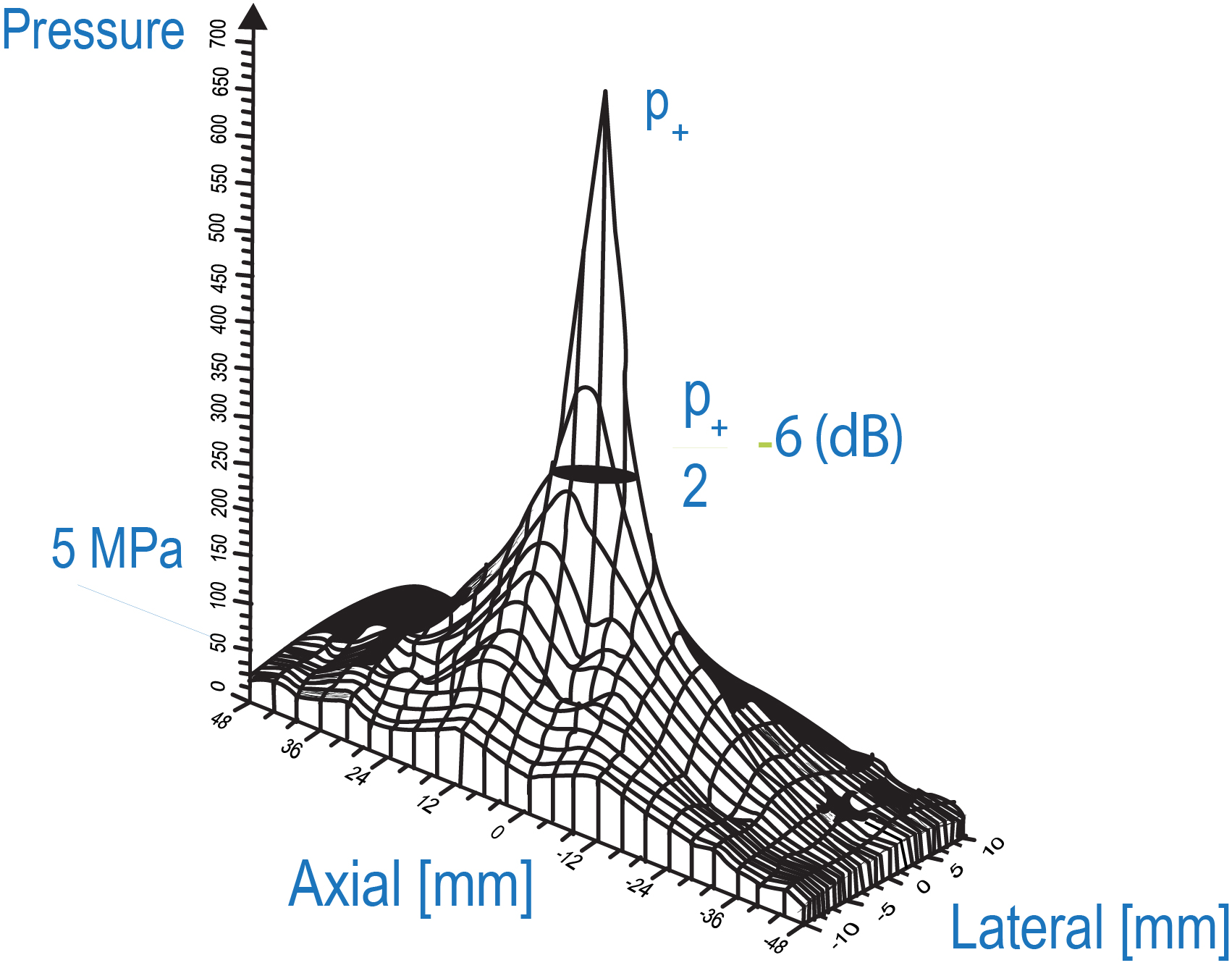 Shock waves are acoustic pulses with high positive pressure, fast and steep rise time followed by comparatively small negative pressure (tensile wave).