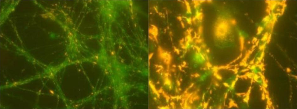 Fluorescent stained mitochondria before and after broad-focused shockwave
